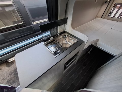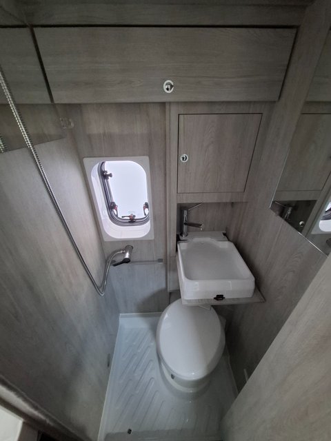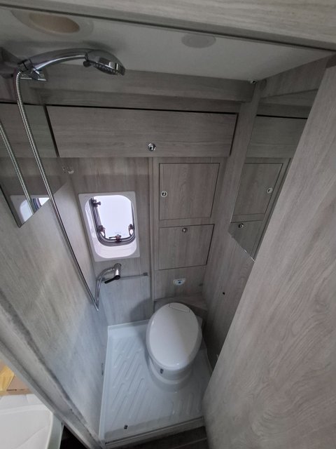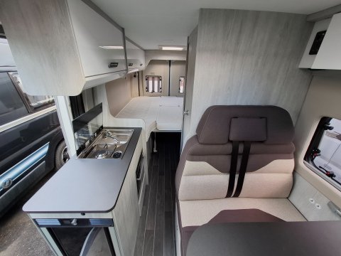 This model is the Livingstone 6 Sport. A 2.2 140bhp euro 6 engine, under 6 meters, 3500KG, two berth with 4 x 3-point belted seats. Half-Dinette, kitchen with hob as well as sink and oven, washroom with shower as well as sink and cassette toilet, rear fixed single beds that can also make up a double bed.