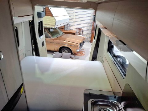 This motorhome is built as a two berth rear lounge model, utilising two shorter bench seats that can create a transverse double bed. Alternatively, the previous owner created a frame and custom mattress to make this a fixed bed. So the choice is yours of whether you travel with a convertible lounge or fixed bed!Â
