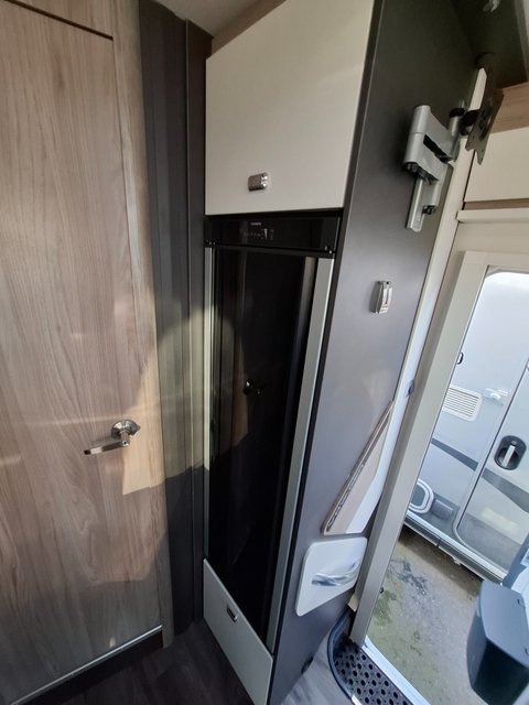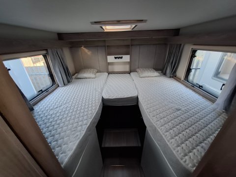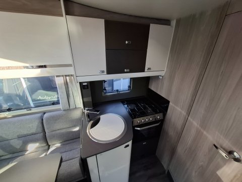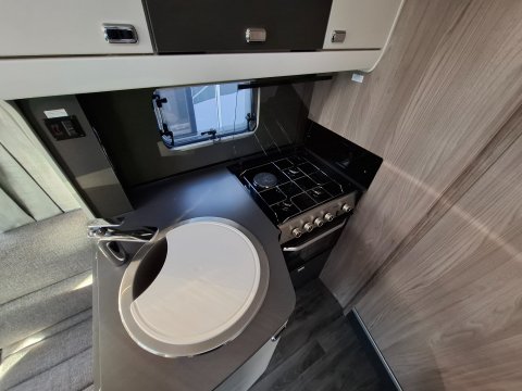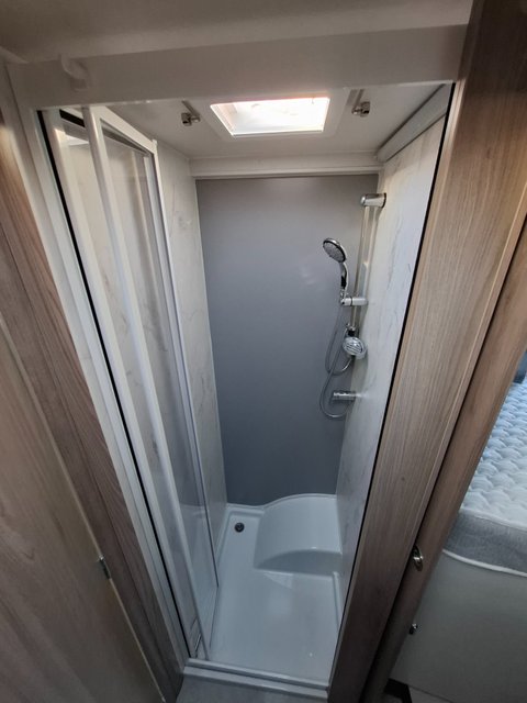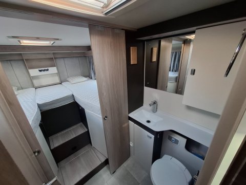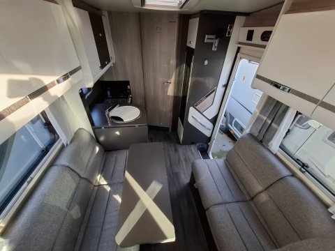 A 2023 Ford based coachbuilt Swift Voyager 584 motorhome with garage, rear fixed bed, lounge, four 3-point belted seats, separate shower and low mileage.